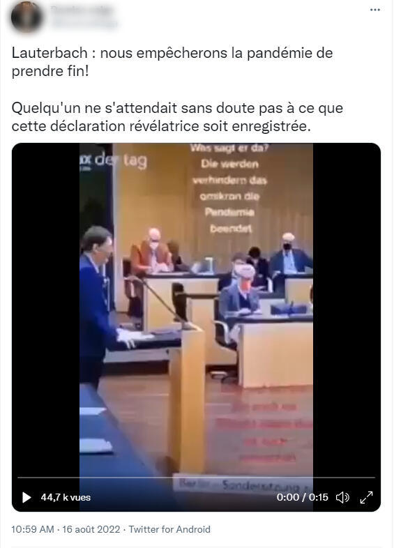 - Depuis le 16 août 2022, plusieurs comptes Twitter francophones affirment que le ministre allemand de la Santé aurait expliqué que son gouvernement “empêchera la fin de la pandémie”. Ces utilisateurs en veulent pour preuve une vidéo de quinze secondes, censée avoir été tournée à l’insu du ministre.