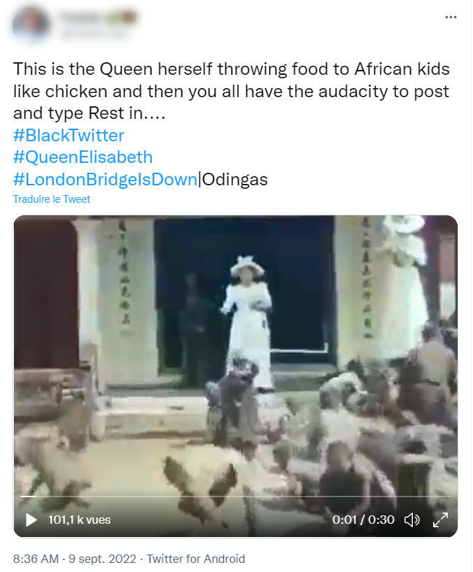Quelques heures à peine après l’annonce du décès d’Elizabeth II, plusieurs comptes Twitter anglophones, notamment kényans et indiens, ont partagé une vidéo censée montrer la reine “jetant de la nourriture à des enfants africains”. Ces images, qui cumulent déjà plus de 100 000 vues, sont utilisées pour critiquer celle qui a régné sur le Royaume-Uni de 1953 à 2022, mais aussi pendant quelques années sur plusieurs autres pays tels que le Kenya, qui n’a accédé à l’indépendance qu’en 1963.
