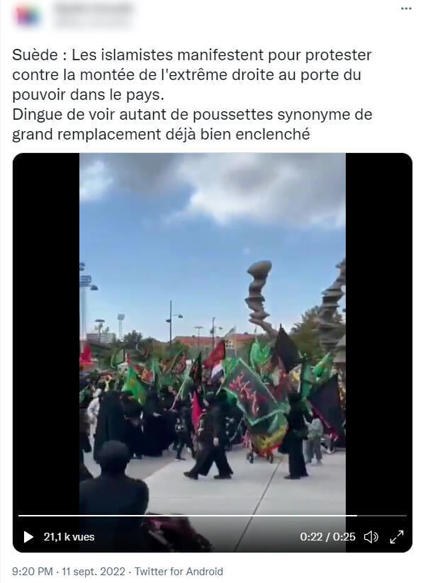 Depuis le 11 septembre 2022, des comptes Twitter francophones partagent une vidéo censée montrer une “manifestation d’islamistes” qui se seraient réunis à Malmö en Suède pour “protester contre la montée de l’extrême droite”. En réalité, ces images montrent une procession religieuse chiite célébrée le 10 septembre en l’honneur de l’imam Hussein. Cette fête a déjà eu lieu à plusieurs reprises dans la ville et n’a aucun lien avec les élections législatives qui se sont tenues le lendemain.