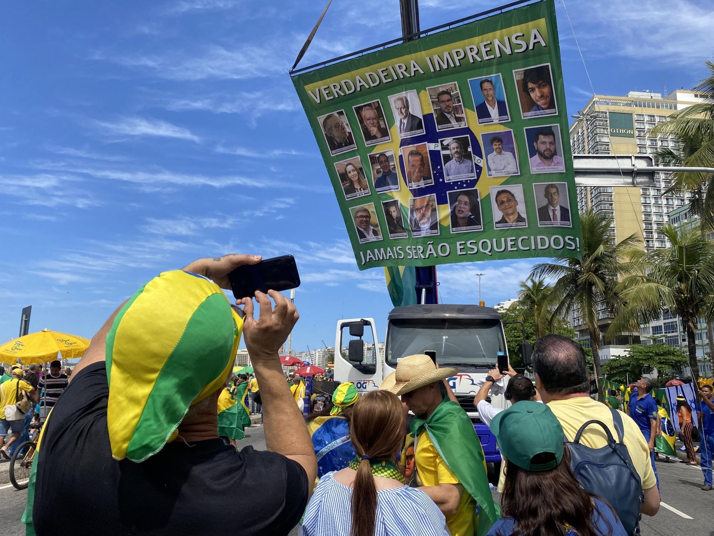 Les réseaux sociaux sont, depuis 2018, le canal privilégié de Jair Bolsonaro pour parler à ses soutiens. Parallèlement, les médias traditionnels représentent l’ennemi à abattre. Certains manifestants scandent ce jour-là : “Les journalistes sont tous corrompus, ce sont des léninistes, des trotskistes”. Sur la chaussée, une gigantesque affiche trône au-dessus des passants. Dessus il est écrit : “La véritable presse” puis une grande mosaïque de visages de blogueurs et autres influenceurs pro-Bolsonaro apparaît. Certains d’entre eux dépassent le million d’abonnés sur les réseaux sociaux et n’hésitent pas à discréditer sur leur compte certains journalistes des principales chaînes de télévision brésilienne : “Vous êtes une honte pour le pays”.