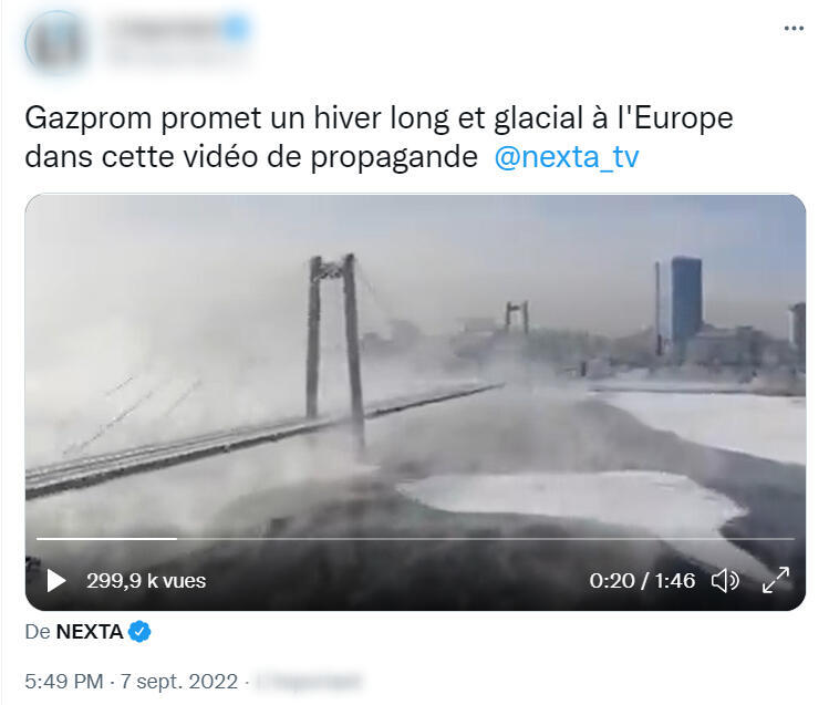 Dans cette vidéo, on retrouve aussi les images d’une ville plongée dans un hiver glacial, censées représenter les villes européennes souffrant d’un manque de gaz naturel. Or ces images montrent en réalité une ville… russe.