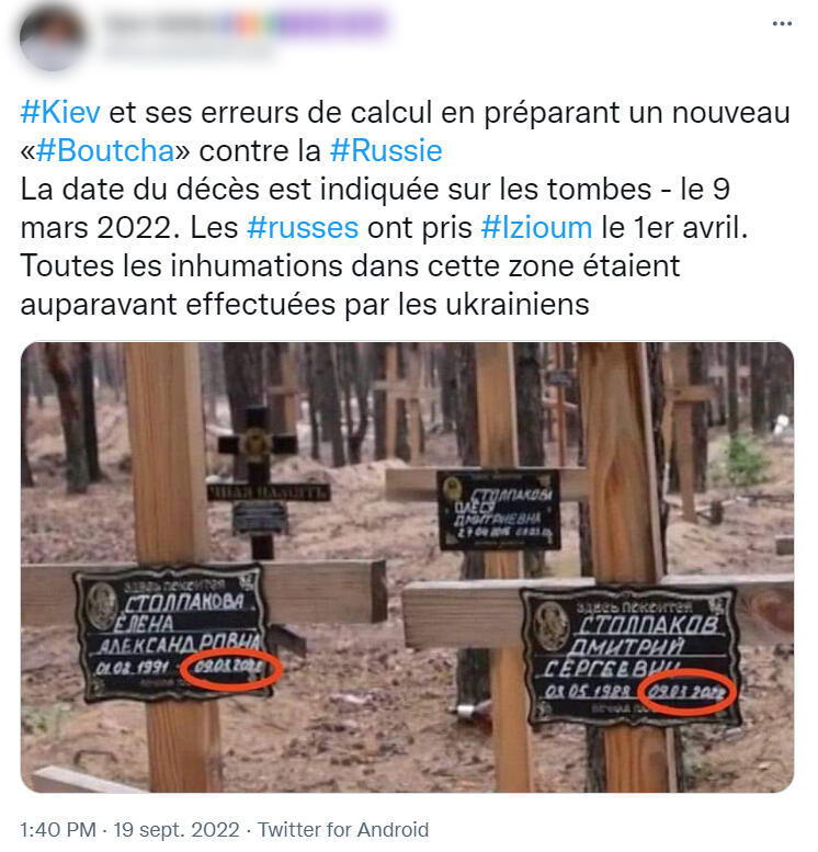 - Depuis le 19 septembre 2022, des comptes Twitter et Facebook partagent une photographie prise à Izioum, dans la forêt où plusieurs centaines de corps ont été découverts. On y aperçoit des tombes sur lesquelles une date de décès est inscrite : le 9 mars 2022.