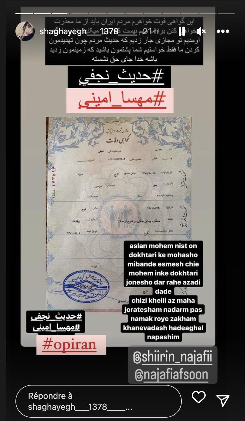 Sur Instagram, Shirin Najafi a relayé des images de l’enterrement et son certificat de décès de sa sœur.